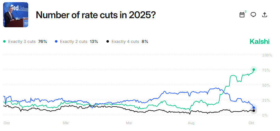 Trader auf Kalshi sehen eine 76 %-Chance für drei Cuts noch in diesem Jahr – bullishe Vorzeichen, trotz der geopolitischen Unsicherheit.