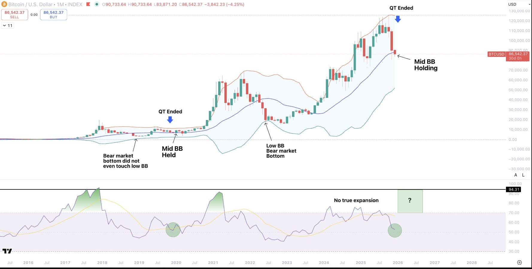 Was mir aber Hoffnung gibt, sind die technischen Indikatoren, allen voran die Bollinger Bänder im Monatschart, sie geben Halt. Bitcoin ist historisch nie nachhaltig unter das untere Band gefallen – auch nicht im Bärenmarkt von 2022.