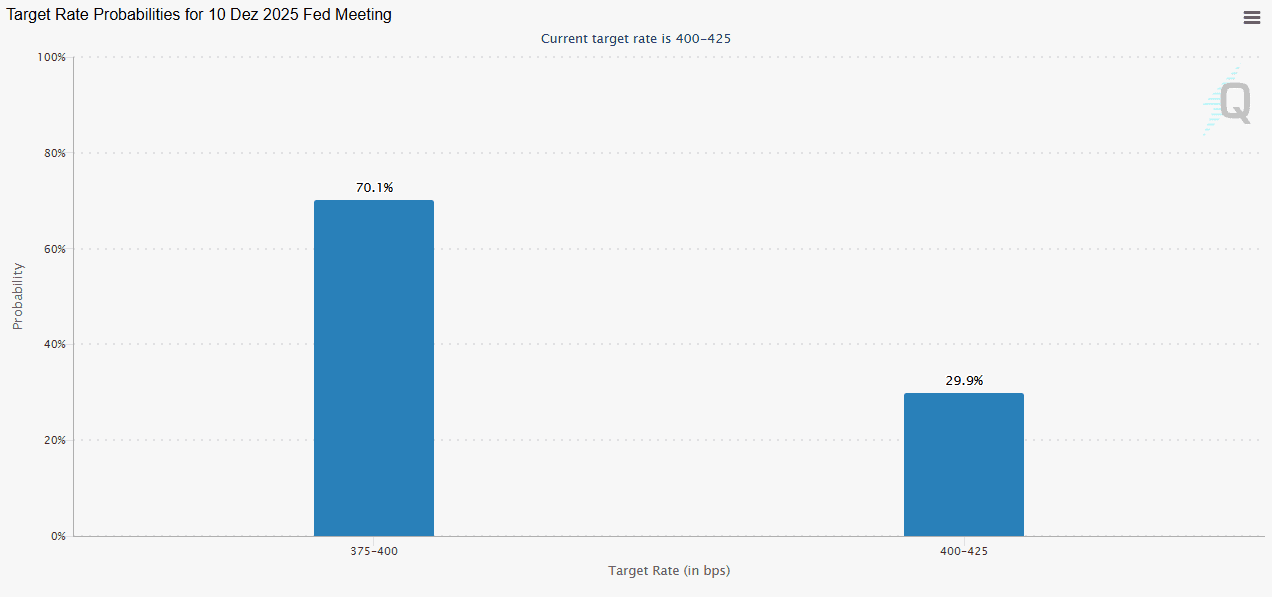Ab Dezember will die Fed zudem ihre Bilanz nicht weiter abbauen – das bedeutet, es kommt zusätzliches Kapital ins Finanzsystem. Dennoch sind viele Erwartungen bereits eingepreist, was den Spielraum für weitere Kurssprünge begrenzt. Laut CME erwarten derzeit 70 % der Marktteilnehmer eine weitere Zinssenkung im Dezember.