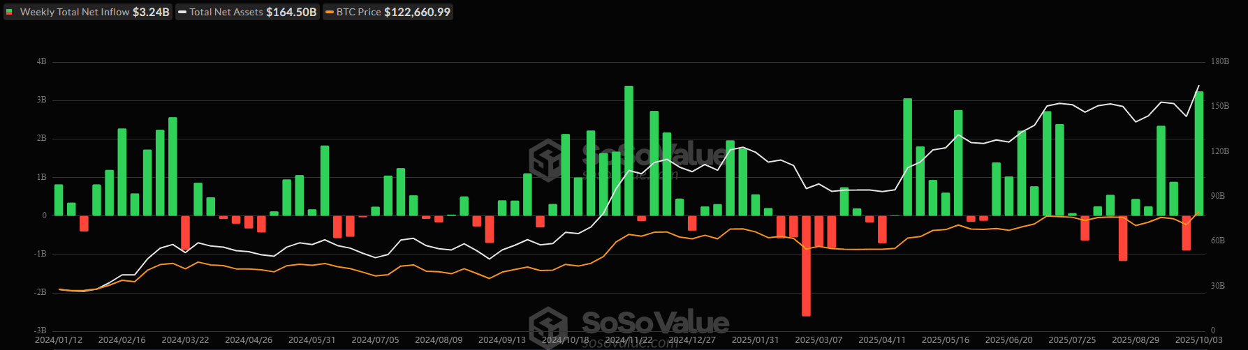 Am Sonntag hat Bitcoin die 125.000-Dollar-Marke durchbrochen – ein neues Allzeithoch. Innerhalb von nur sieben Tagen ist BTC über 11 % gestiegen. Der Grund? Ganz klar: die massiven Spot-ETF-Zuflüsse. Über 3,2 Milliarden Dollar wurden allein letzte Woche investiert – die zweithöchste Summe seit dem Start der Produkte.