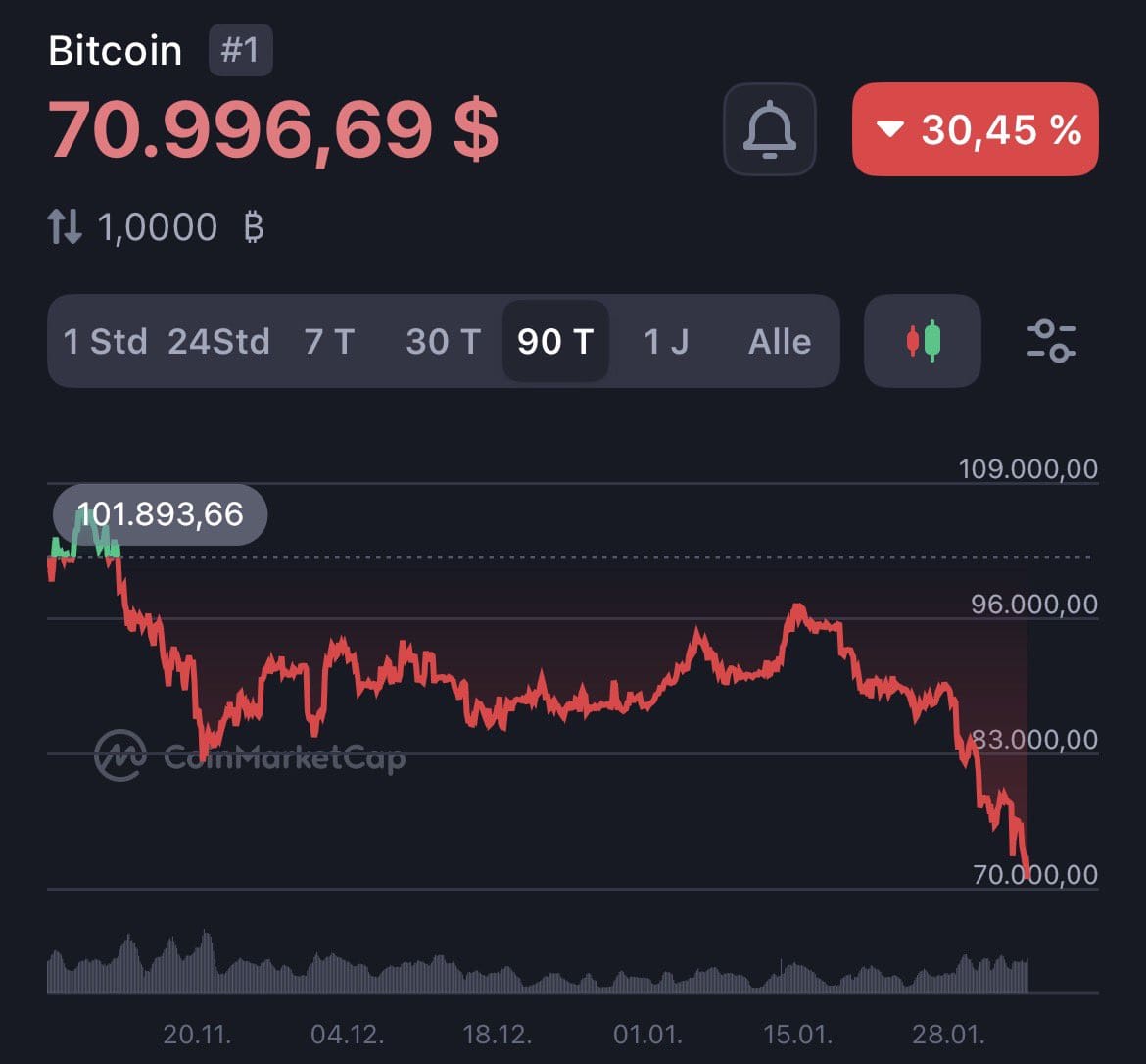 Parallel zum institutionellen Ausstieg zeigt sich eine deutliche Marktpanik: Bitcoin ist auf etwa 71.000 US-Dollar gefallen und hat damit sämtliche Zugewinne seit der US-Präsidentschaftswahl wieder verloren.
