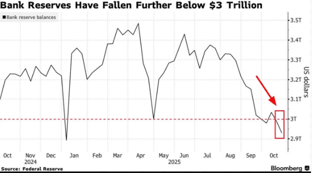 Gleichzeitig beobachte ich sehr genau, was auf makroökonomischer Ebene passiert. Die sinkende Liquidität im Bankensystem bringt laut dem Kobeissi Letter die Fed in eine Zwickmühle.