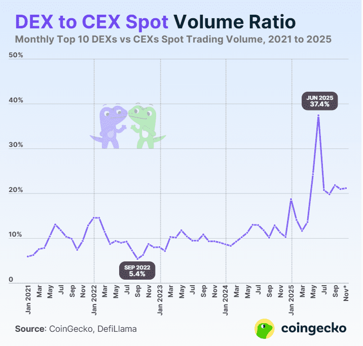 Laut Coingecko lag ihr Anteil am Spot-Handel dieses Jahr phasenweise bei über 37 %, aktuell konstant bei über 21 %.