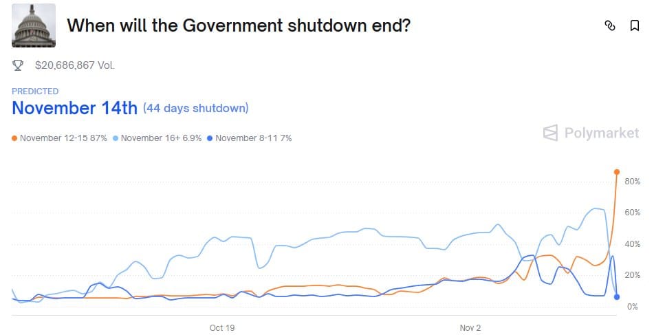 Auf Polymarket rechnen mittlerweile über 50 % der Nutzer mit einem Ende des Shutdowns noch in dieser Woche – das hat die Kurse ordentlich in Bewegung gebracht.