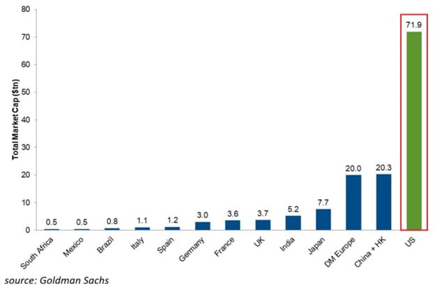 Mit einer Marktkapitalisierung von rund 70 Billionen US-Dollar haben die US-Börsen historische Höchststände erreicht. Zum Vergleich: Das ist fast 2-mal so groß wie die europäischen und chinesischen Märkte zusammen.