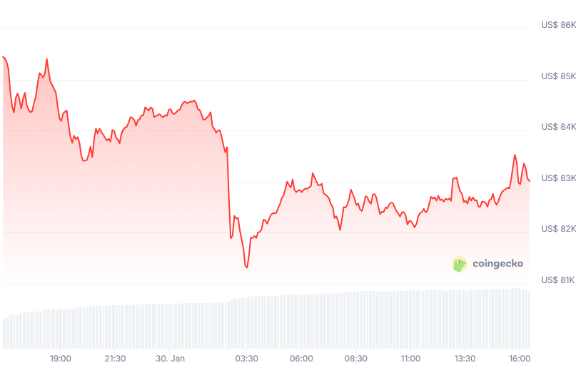 Es ist ein Tag mit negativem Sentiment für den Kryptomarkt. Der Gesamtwert aller Kryptos zusammen ist in den letzten 24 Stunden um etwa 1,8 Prozent gefallen. Bitcoin, die größte und einflussreichste Coin, führt diesen Rückgang mit einem Verlust von 2,5 Prozent an und wird derzeit bei rund 83.182 Dollar gehandelt. In Euro entspricht das einem Kurs von etwa 70.038.