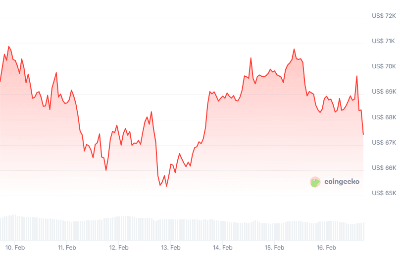 Der Kryptomarkt zeigt heute einen leichten Rückgang. Der Gesamtwert aller Kryptowährungen zusammen ist um etwa 2,0 Prozent auf 2,4 Billionen Dollar gefallen. Diese Bewegung wird größtenteils von Bitcoin angeführt, der in den letzten 24 Stunden um 2,2 Prozent gefallen ist. Der Kurs liegt derzeit bei etwa 67.374 Dollar, was 57.635 Euro entspricht.