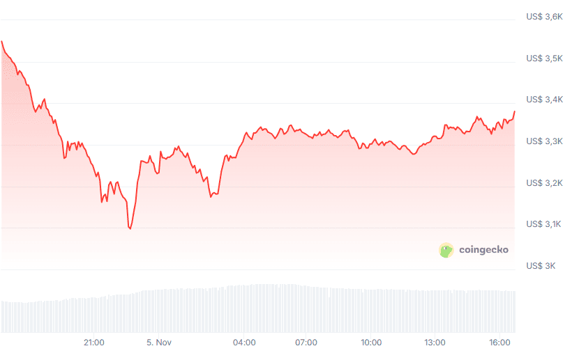 Auf dem Chart ist zu sehen, dass der Ethereum-Kurs seit dem Ende des Nachmittags gestern stark von 3.600 Dollar auf 3.100 Dollar um 22:30 Uhr deutscher Zeit fiel. Dies kam einem Rückgang von fast 14 Prozent in nur wenigen Stunden gleich. Seit heute Morgen konnte der Kurs etwas steigen und stabil um das Niveau von 3.300 Dollar bleiben.