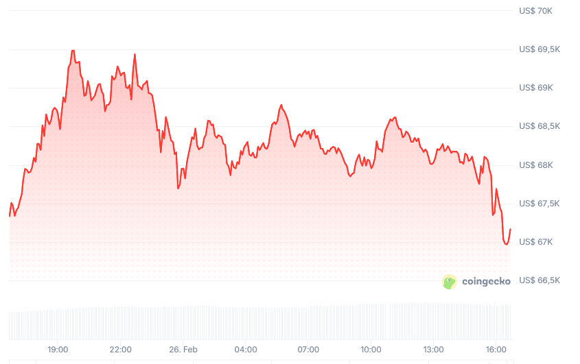 Bitcoin folgt diesem Trend und verzeichnet ein kleines Minus. Zum Zeitpunkt des Verfassens liegt der Kurs bei 67.138 Dollar, ein Rückgang von 0,3 Prozent. In Euro entspricht das 57.003 Euro, ein Minus von 0,5 Prozent.
