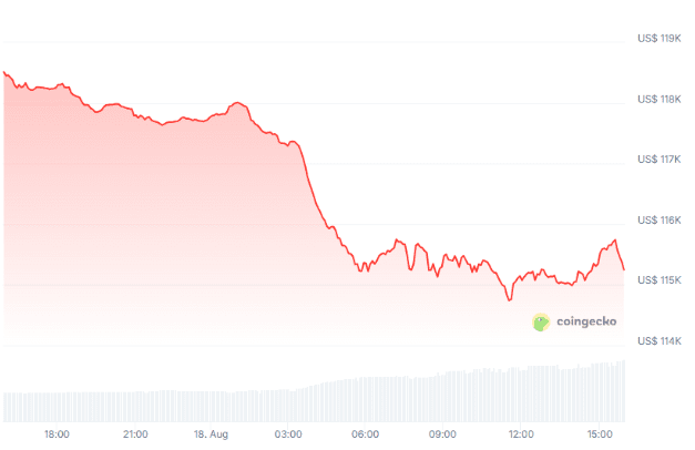 Auch Marktführer Bitcoin (BTC) konnte der heutigen Korrektur nicht entkommen. Der Kurs ist um 2,8 Prozent auf 115.187 Dollar gefallen. Damit hat Bitcoin momentan eine Marktkapitalisierung von 1,88 Billionen Euro. Während Bitcoin vor dem Wochenende noch ein All-Time High von 124.000 Dollar erreichen konnte, ist seitdem ein deutlicher Rückgang eingetreten. Dies ist natürlich nicht ungewöhnlich in der Kryptowelt.