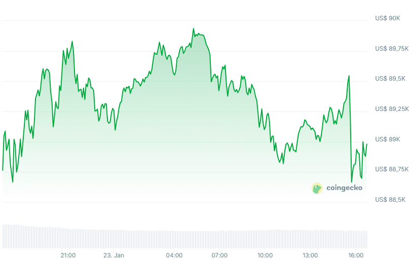 Bitcoin blieb heute relativ stabil mit einem kleinen Anstieg von 0,3 Prozent. Der Kurs schwankte heute zwischen 88.500 und 89.750 Dollar.