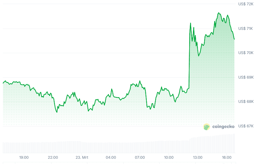 Die Gesamtmarktkapitalisierung aller Kryptowährungen ist in den vergangenen 24 Stunden um 3,3 Prozent auf rund 2,53 Billionen Dollar gestiegen. Dieses Wachstum wird hauptsächlich von Bitcoin (BTC) getragen, der einen Anstieg von 2,5 Prozent verzeichnet. Der Preis liegt derzeit bei etwa 70.394 Dollar, was 61.408 Euro entspricht.