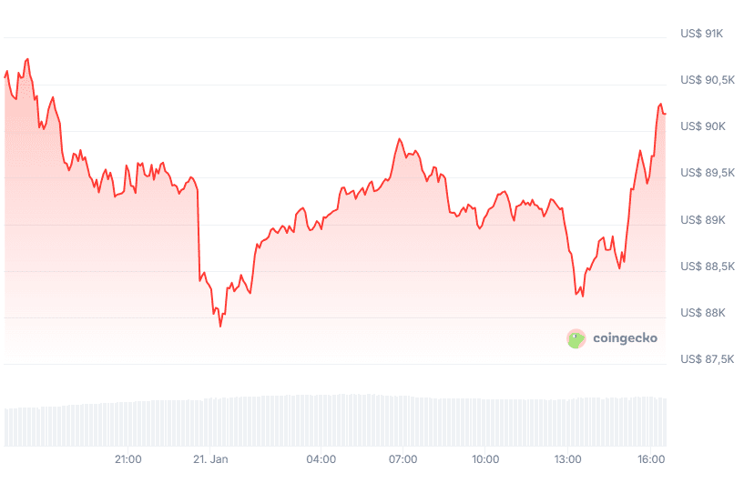 Zum Zeitpunkt des Schreibens ist der Kryptomarkt im Wert etwas gesunken und steht bei 3,13 Billionen Dollar. Dies spiegelt sich direkt in den Kursen wider. In den Top 10 sehen wir einige leichte Rückgänge aber auch Anstiege. So ist Bitcoin um 0,7 Prozent auf 90.000 Dollar gefallen. Die Coin fiel heute früher noch unter 88.000 Dollar, konnte sich aber im Laufe des Nachmittags leicht erholen.