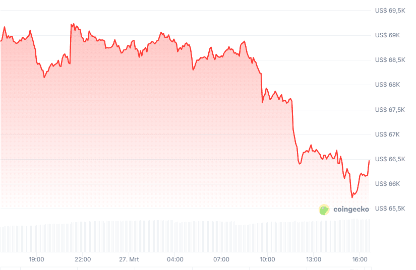 Bitcoin steht zum Zeitpunkt des Verfassens bei rund 66.206 Dollar, ein Rückgang von 3,8 Prozent in den vergangenen 24 Stunden. In Euro entspricht das einem Preis von 57.411 Euro, ein vergleichbarer Rückgang von 3,7 Prozent. Die Kursbewegung zeigt, dass Anleger derzeit vorsichtig agieren.