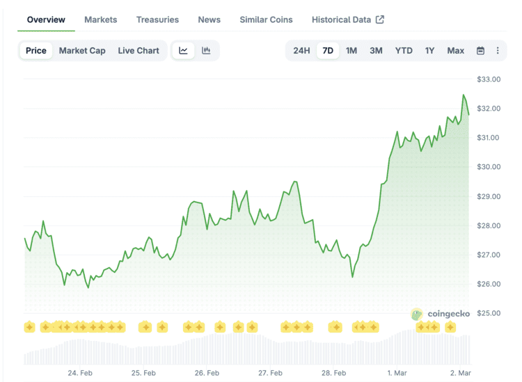 Der Krypto-Coin HYPE, der zur Hyperliquid-Plattform gehört, ist in der vergangenen Woche um etwa 15 Prozent gestiegen. Der Kurs stieg von rund 27 Dollar auf ein Hoch von etwa 32 Dollar und liegt aktuell bei rund 31 Dollar. Damit gehört HYPE diese Woche zu den stärkeren Gewinnern im Kryptomarkt.
