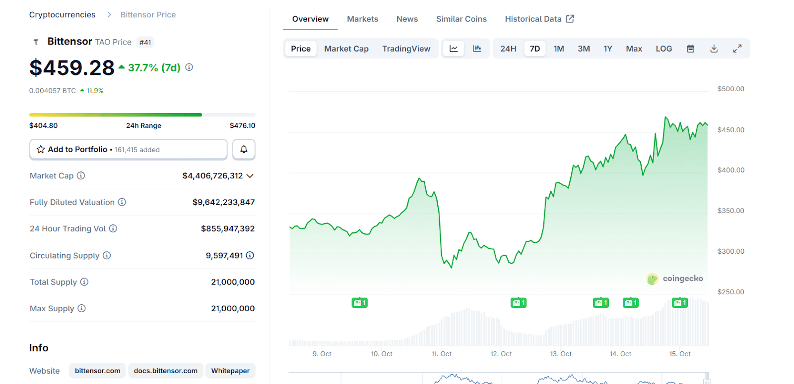 In nur sieben Tagen legte der Kurs um fast 38 % zu und notiert derzeit bei 459 US-Dollar. Damit gehört Bittensor zu den stärksten Performern unter den Altcoins und zieht vor allem in Deutschland die Aufmerksamkeit zahlreicher Anleger auf sich.