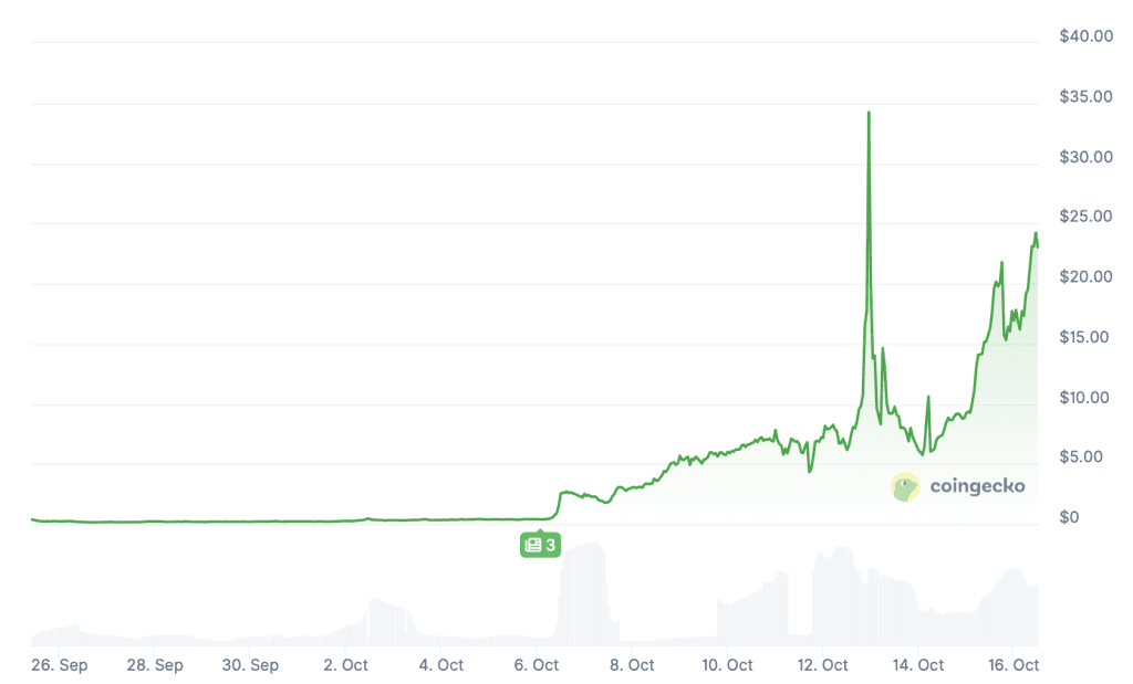 In den letzten zwei Wochen steht COAI ziemlich im Rampenlicht. Nach langer Zeit stetigen Wachstums explodierte der Kurs des Tokens am Sonntag plötzlich von 6,50 Dollar auf über 34 Dollar. Damit erreichte der Kurs ein Preisniveau, das satte 13.500 Prozent höher lag als bei der Einführung.