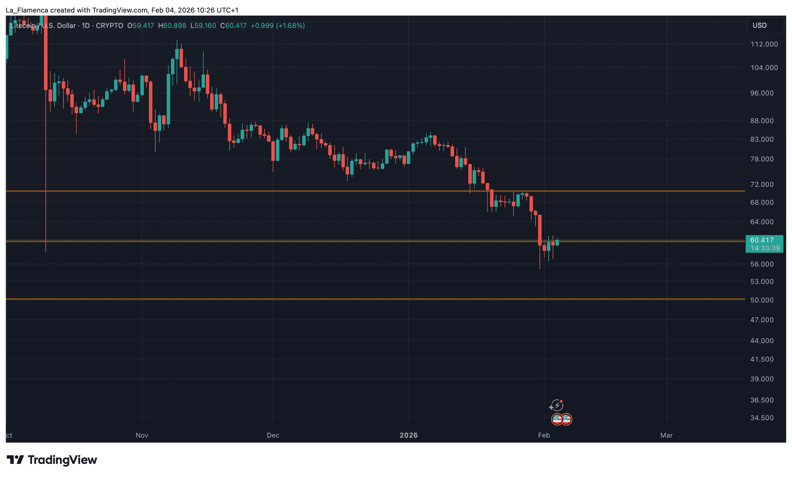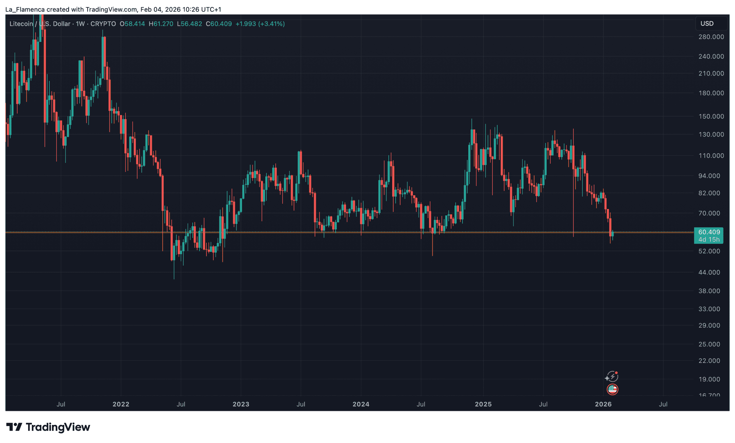 Der Kurs von Litecoin ist an einem bekannten Preisniveau angekommen. Seit Jahren sorgt der Preis von 60 US‑Dollar sowohl für Unterstützung als auch für Widerstand. Zum Zeitpunkt des Schreibens liegt Litecoin bei 60,41 US‑Dollar.