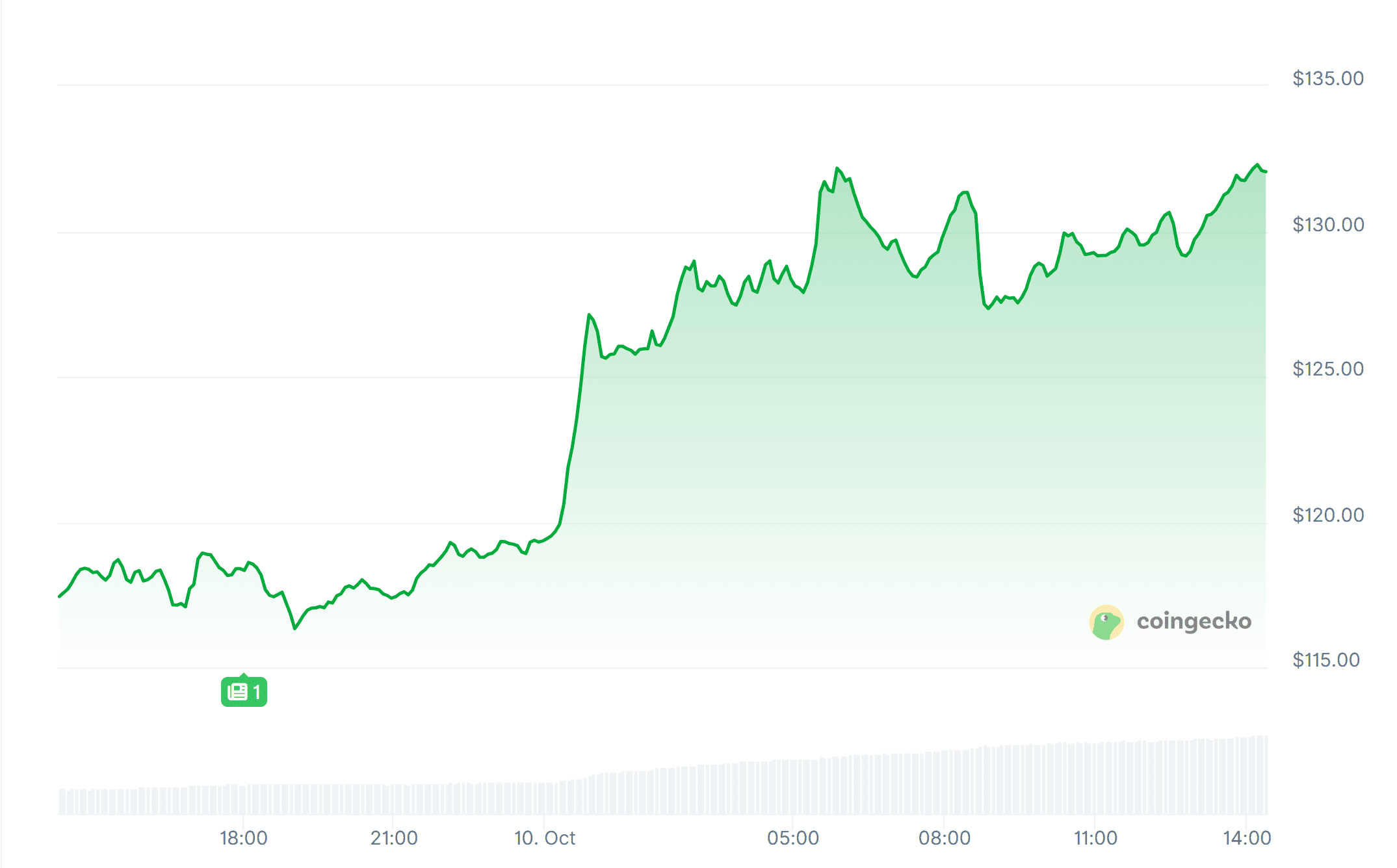 Dieser Preispunkt wurde getestet und mehrmals fiel die Coin wieder unter 130 Dollar, aber momentan hält der Kurs bei einem Preispunkt von 132,18 Dollar stand. Damit ist der Kurs innerhalb von 24 Stunden um 12,4 Prozent gestiegen.
