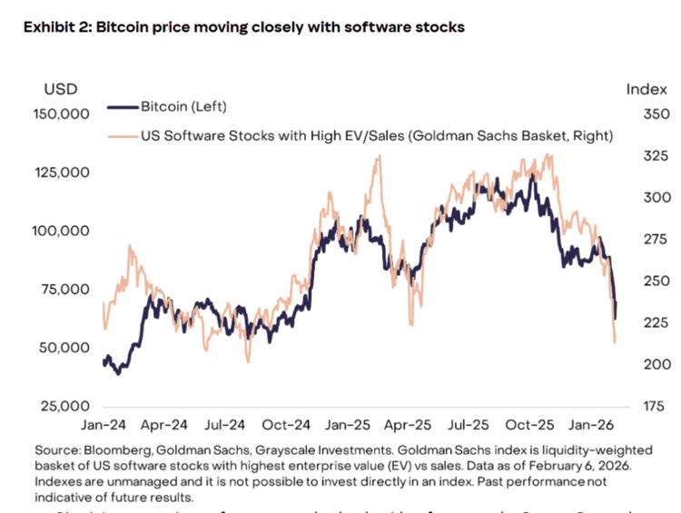 Das Unternehmen untersuchte die Beziehung zwischen Bitcoin und Software-Unternehmen. In den vergangenen zwei Jahren bewegten sie sich oft in dieselbe Richtung. Fällt der Software-Sektor, dann sinkt Bitcoin meist mit. Steigt der Sektor, dann steigt Bitcoin oft auch.