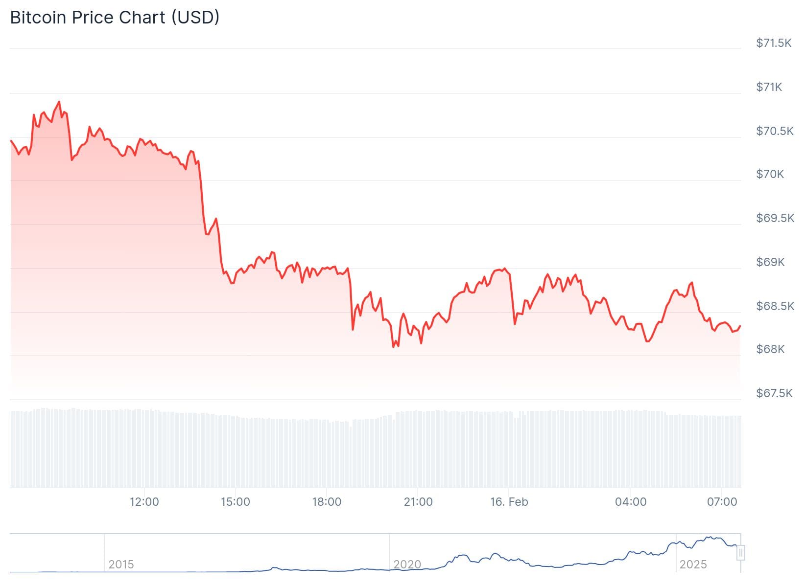 Bitcoin fiel um etwa drei Prozent von 70.300 Dollar auf 68.200 Dollar. Dieser Tiefpunkt wurde gegen 19:00 Uhr erreicht, aber seitdem hat sich der Kurs kaum mehr bewegt.