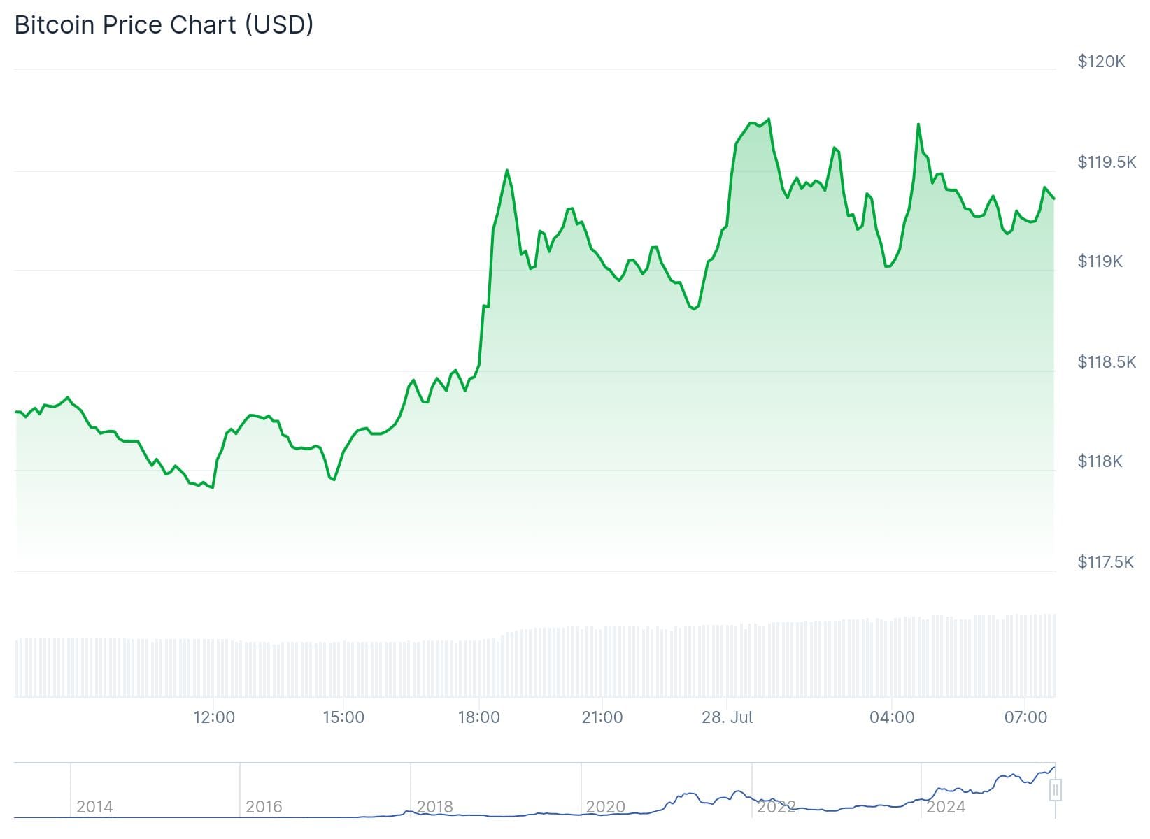 Zum Zeitpunkt des Schreibens steht der BTC-Preis auf der Kryptobörse Coinbase bei 119.465 Dollar. Auf der Kryptobörse Bitpanda kommt der BTC-Preis in Euro damit auf 101.680. Gegenüber vor 24 Stunden steht BTC 1,03 Prozent im Plus.