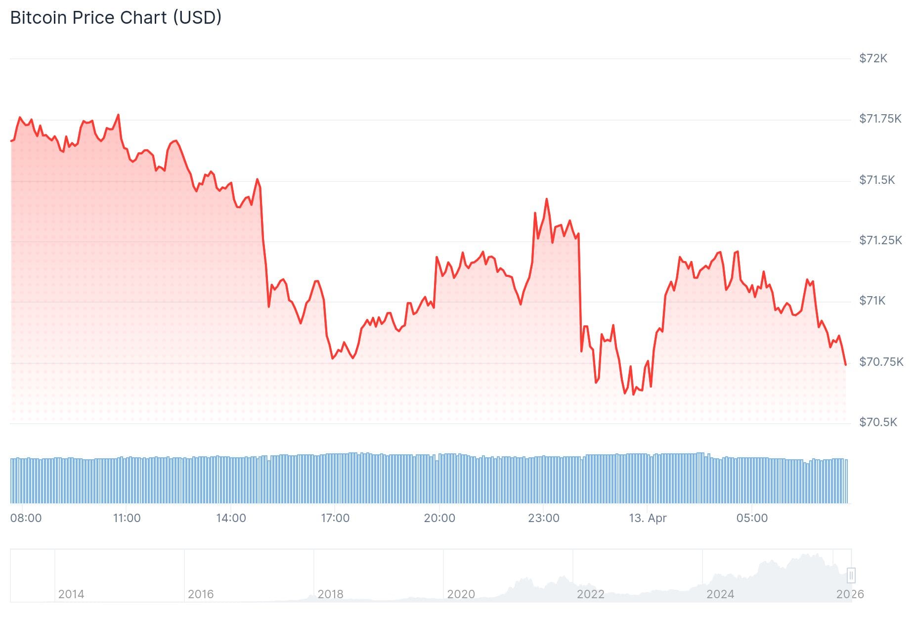 Innerhalb einer Stunde fiel Bitcoin von etwa 73.000 Dollar auf 71.700 Dollar. Dort legte der Kurs eine Pause ein, um dann am Nachmittag weiter zu fallen.