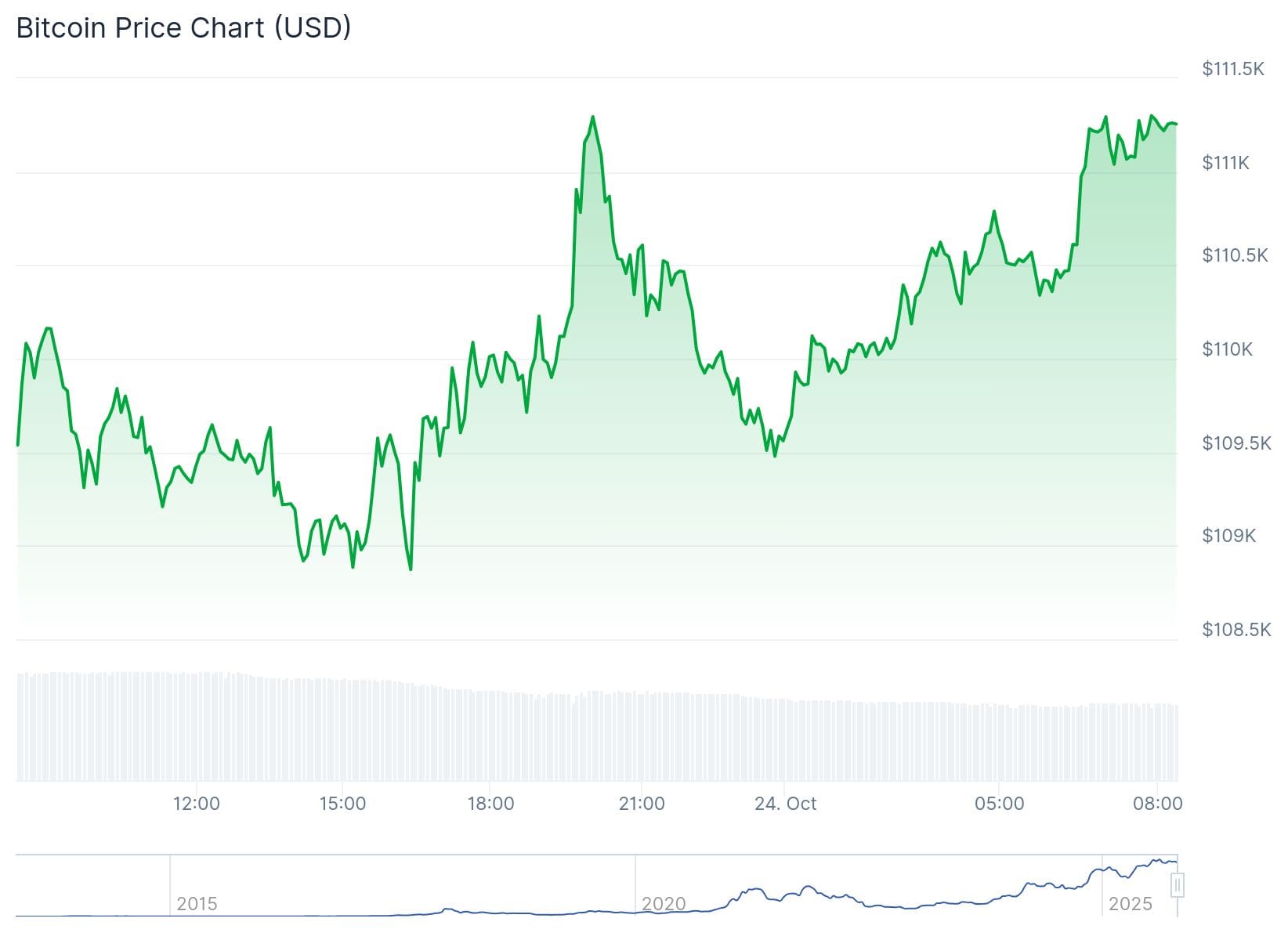 Zum Zeitpunkt des Schreibens steht der BTC-Preis auf der Kryptobörse Coinbase bei 111.480 Dollar. Auf der Kryptobörse Bitpanda kommt der BTC-Preis in Euro damit auf 96.026. Im Vergleich zu vor 24 Stunden steht BTC 1,52 Prozent im Plus.