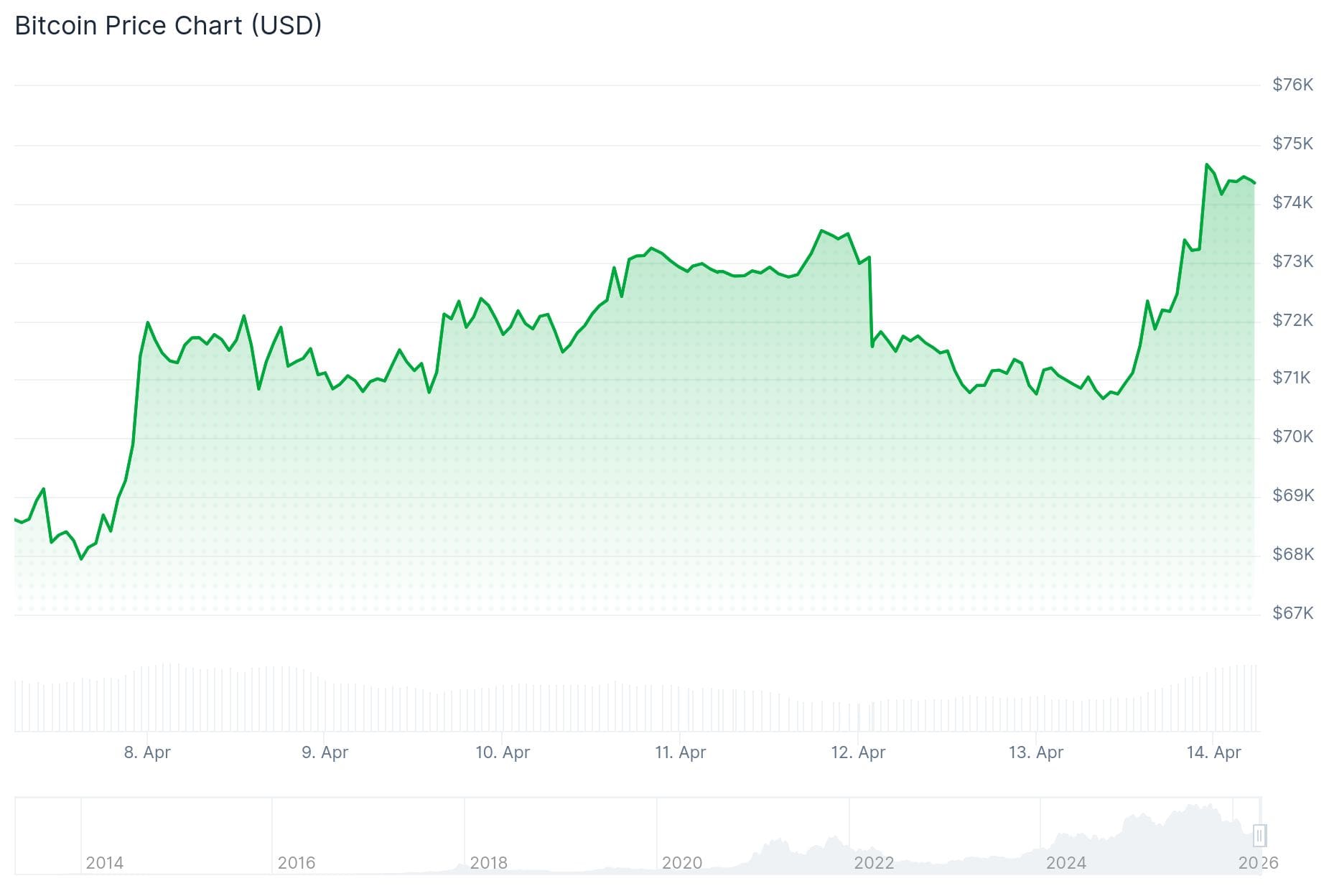 Bitcoin stieg von weniger als 71.000 Dollar auf 74.400 Dollar. Zu Beginn der Nacht wurde ein Höchststand von fast 74.900 Dollar erreicht. Das ist der höchste gemessene Stand seit dem 17. März. An diesem Tag wurde die Marke von 76.000 Dollar berührt.