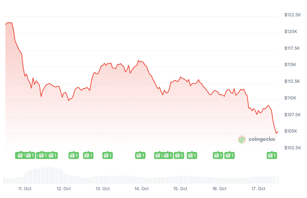 Zum Zeitpunkt des Schreibens liegt der Bitcoin-Kurs bei 105.150 Dollar, ein Ende des Rückgangs ist nicht in Sicht.