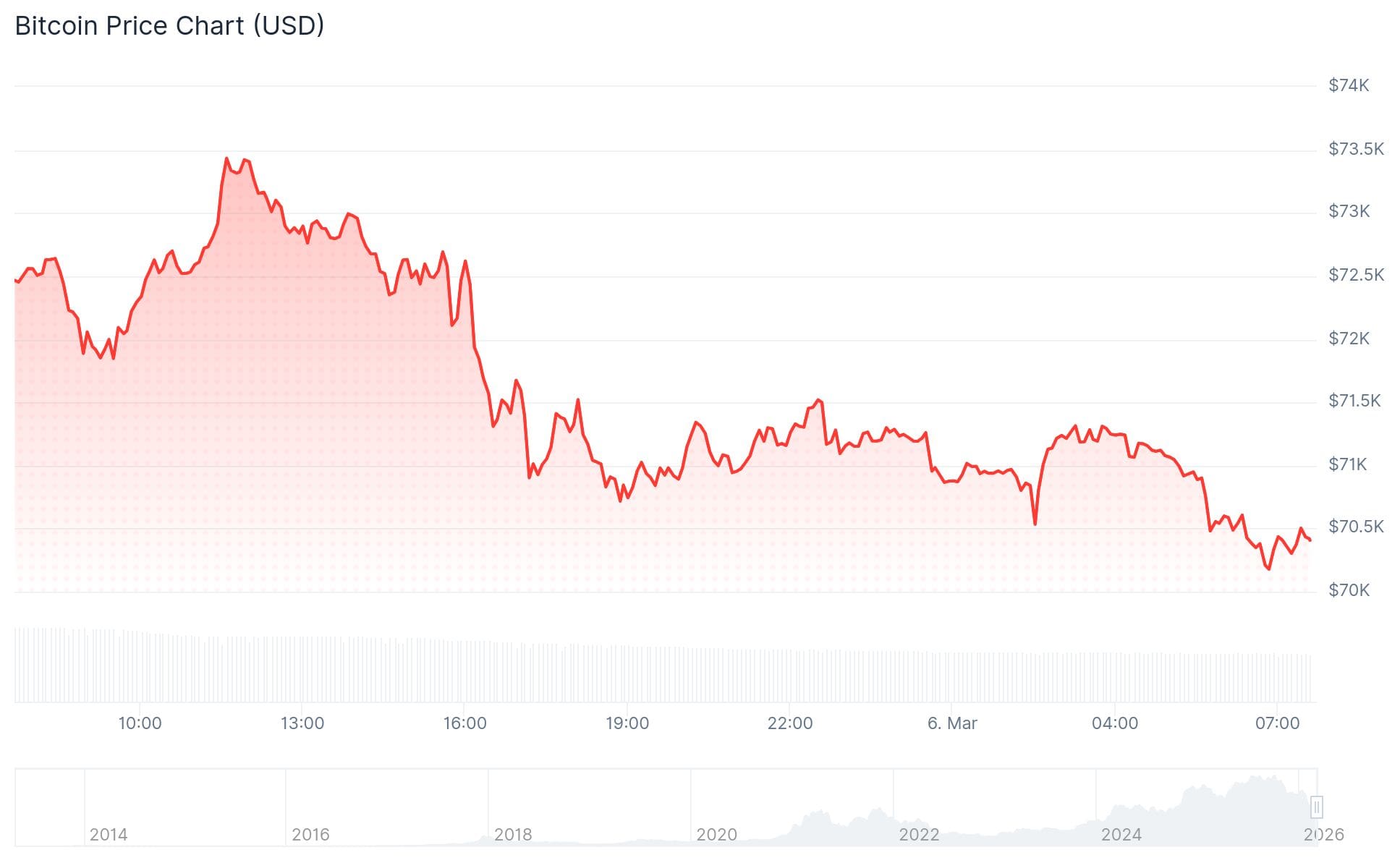 Bitcoin fiel von 73.500 Dollar auf knapp unter 71.000 Dollar. Und heute Morgen ist er noch etwas weiter auf knapp über 70.000 Dollar gesunken.