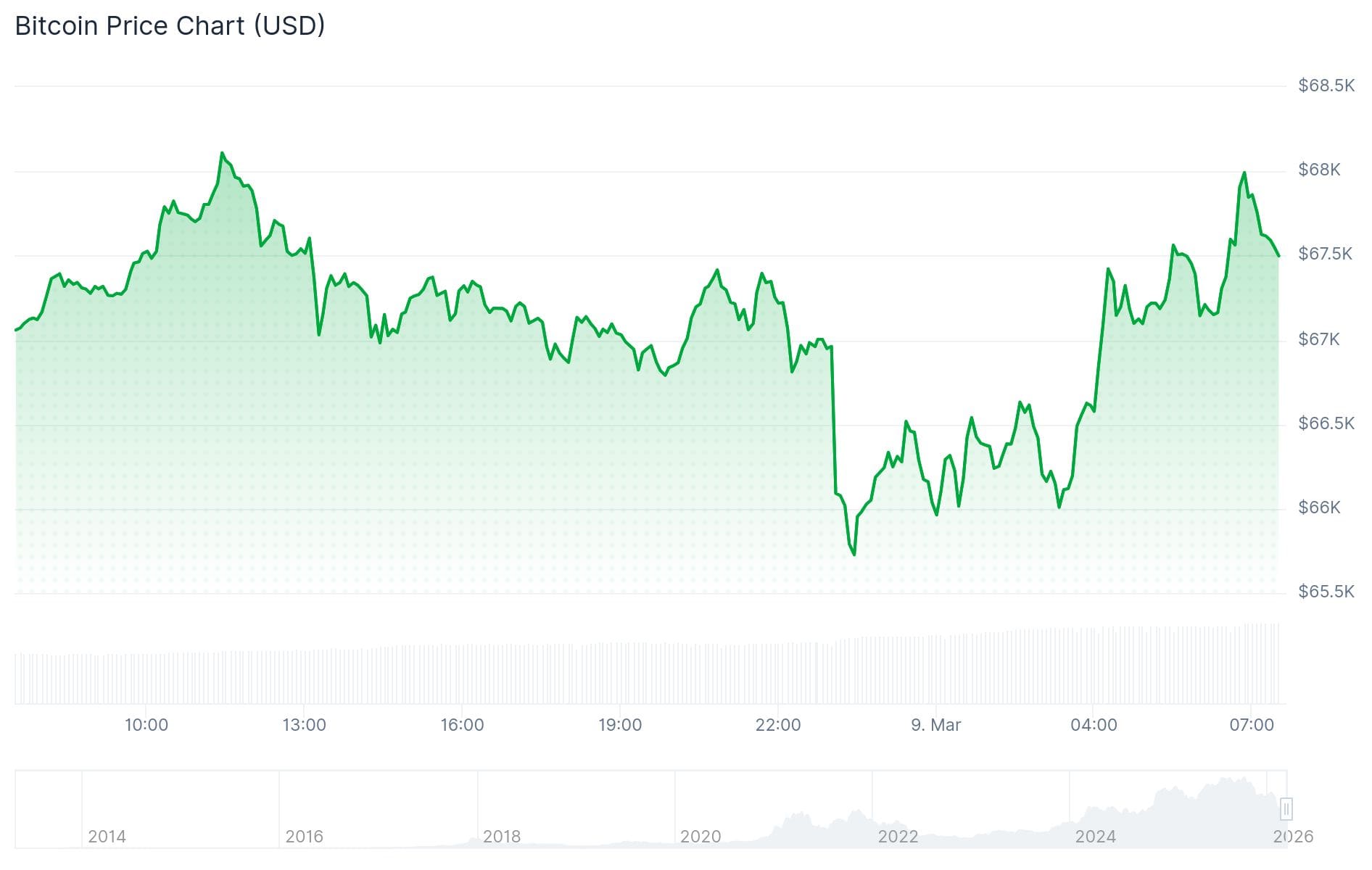 Danach erholte sich Bitcoin langsam, aber in der Nacht um 03:20 Uhr gewann der Kurs plötzlich an Fahrt. Innerhalb einer Stunde stieg der Kurs zurück auf fast 67.600 Dollar, und am Morgen wurde sogar wieder die Marke von 68.000 Dollar erreicht.