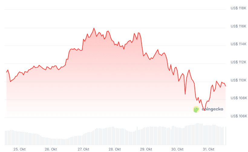 Am Donnerstagabend erreichte der Kurs einen lokalen Tiefpunkt bei etwa 106.780 Dollar, bevor er wieder den Weg nach oben fand. Die Grenze von 110.000 Dollar erwies sich anschließend als psychologische Schwelle, die Bitcoin bis jetzt nicht durchbrechen konnte.