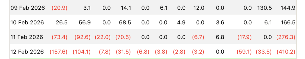 Auch die Zu- und Abflüsse von Bitcoin-Börsenfonds (ETFs) bleiben wechselhaft. In letzter Zeit floss an manchen Tagen wieder Geld in die Fonds, aber diese wurden mit Tagen hoher Abflüsse abgewechselt.