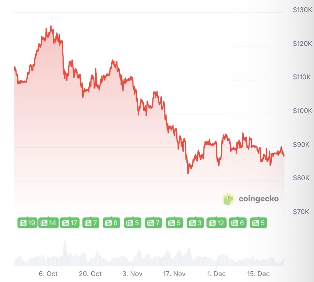 Bitcoin ist gestern in weniger als acht Stunden um drei Prozent gefallen. Der Kurs erreichte heute Morgen einen Tiefpunkt um 87.000 Dollar, aber mittlerweile ist die Coin 87.770 Dollar wert.