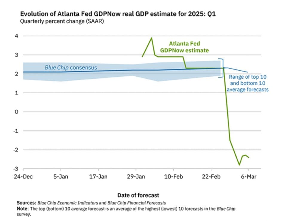 Wenn die Trump-Regierung bewusst wirtschaftliche Unruhe verursachen will, um die Zinsen zu senken, dann gelingt ihnen das. Die große Panik und Rezessionsangst entstand unter anderem durch das Atlanta Fed GDPNow-Modell, das das Wirtschaftswachstum für Q1 2025 vorhersagt.