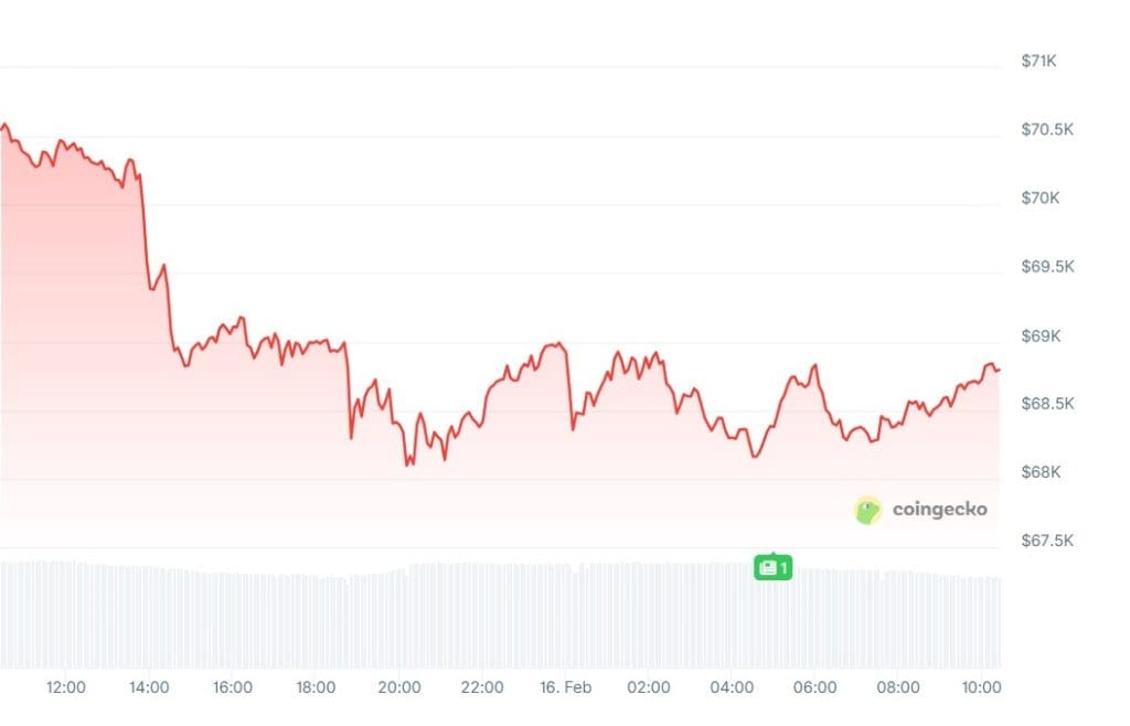 - Bitcoin bleibt unter 70.000 US-Dollar und fiel nach einer Zurückweisung zurück in den unteren Bereich von 68.000 US-Dollar.