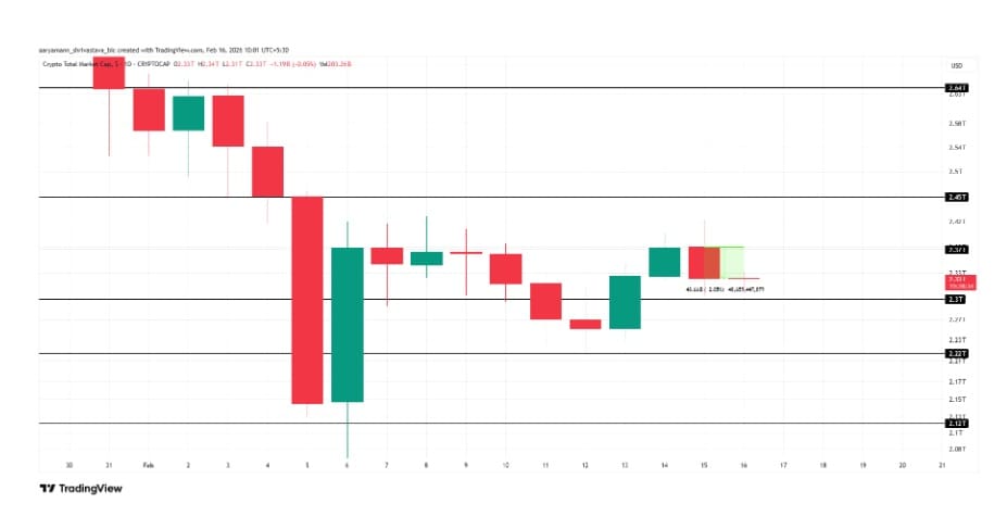 - Die Gesamtmarktkapitalisierung des Kryptomarktes sank um rund 48 Milliarden US-Dollar, nachdem ein Ausbruch über 2,37 Billionen US-Dollar ausblieb.