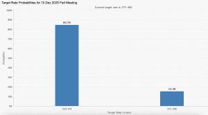 Mit Stichtag 28. November zeigt das FedWatch Tool eine ungewöhnlich klare Erwartungslage: 84,7 Prozent der Marktteilnehmer rechnen mit einer Zinssenkung. Zum Vergleich: Noch vor einem Monat lag die Wahrscheinlichkeit bei nur 5,5 Prozent. Die aktuellen Wahrscheinlichkeiten: