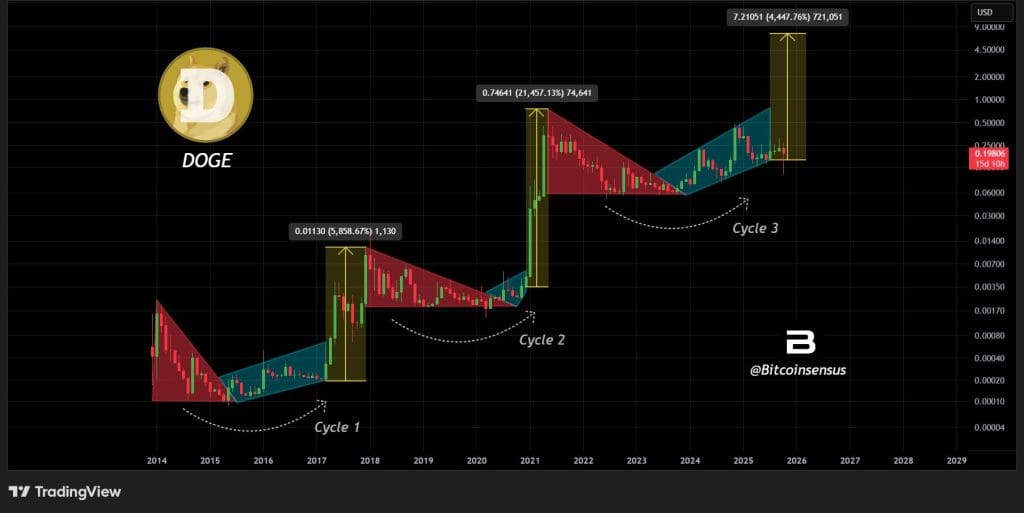 Die Analyse zeigt, dass ein typischer Marktzyklus rund vier Jahre dauert. Am Ende der letzten beiden Zyklen kam es bei Dogecoin jeweils zu einer explosiven Rally und einem neuen Allzeithoch.