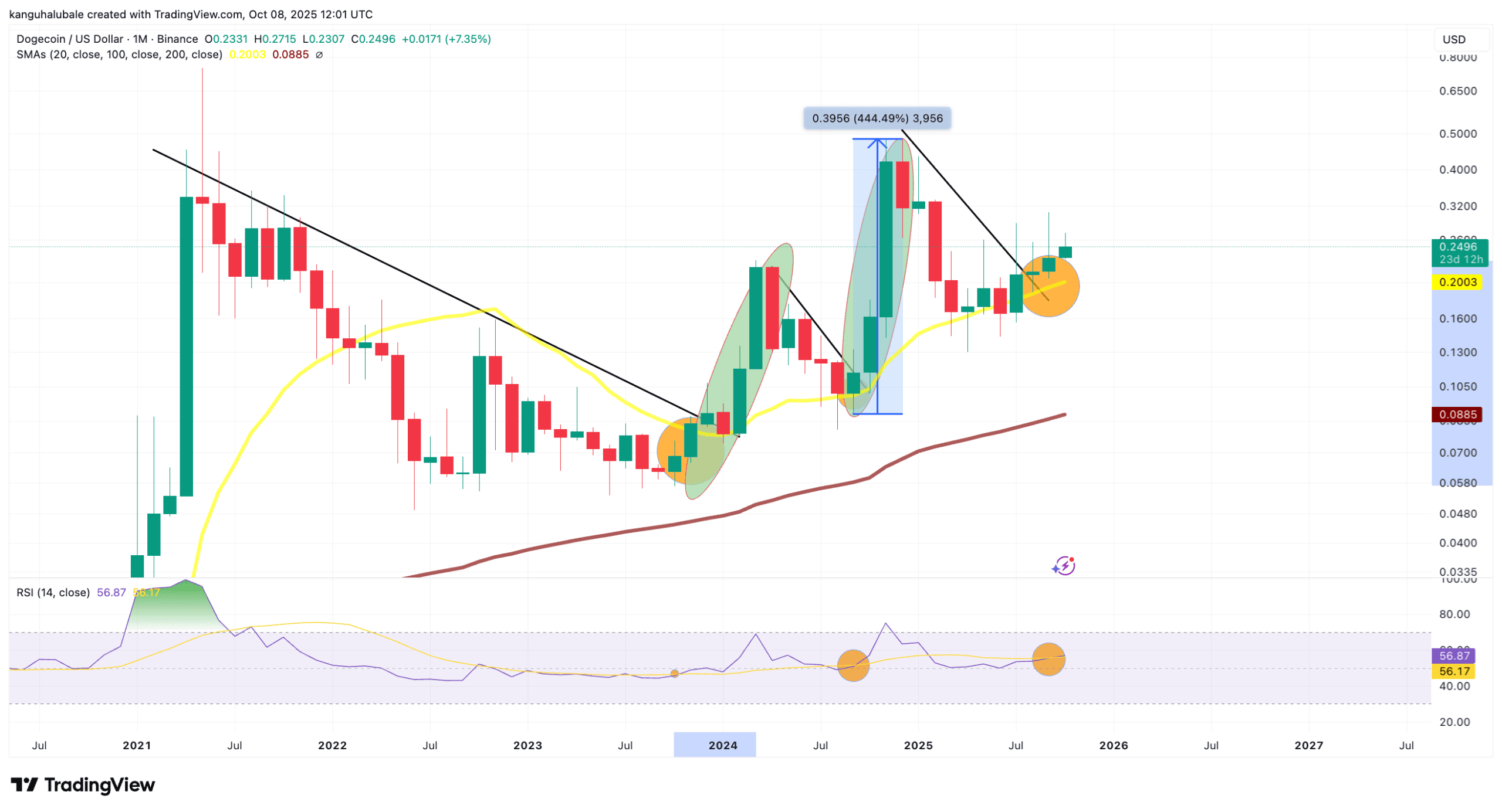 In der Vergangenheit zeigte Dogecoin starke Kursanstiege, wenn die RSI-Linie über die SMA-Linie (einfacher gleitender Durchschnitt) stieg – unten im Chart im orangefarbenen Kreis zu sehen. Im Oktober 2023 folgte eine Rally von 302 Prozent, und Ende 2024 ein Anstieg von 445 Prozent.