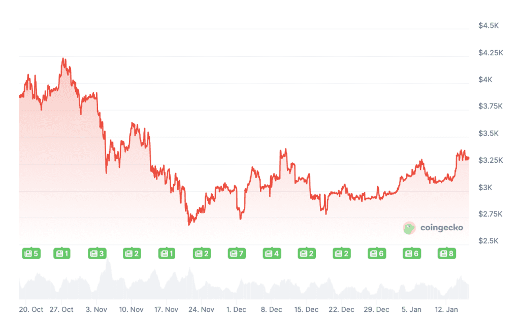 Oben: Kursgrafik von Ethereum, Quelle: CoinGecko.
