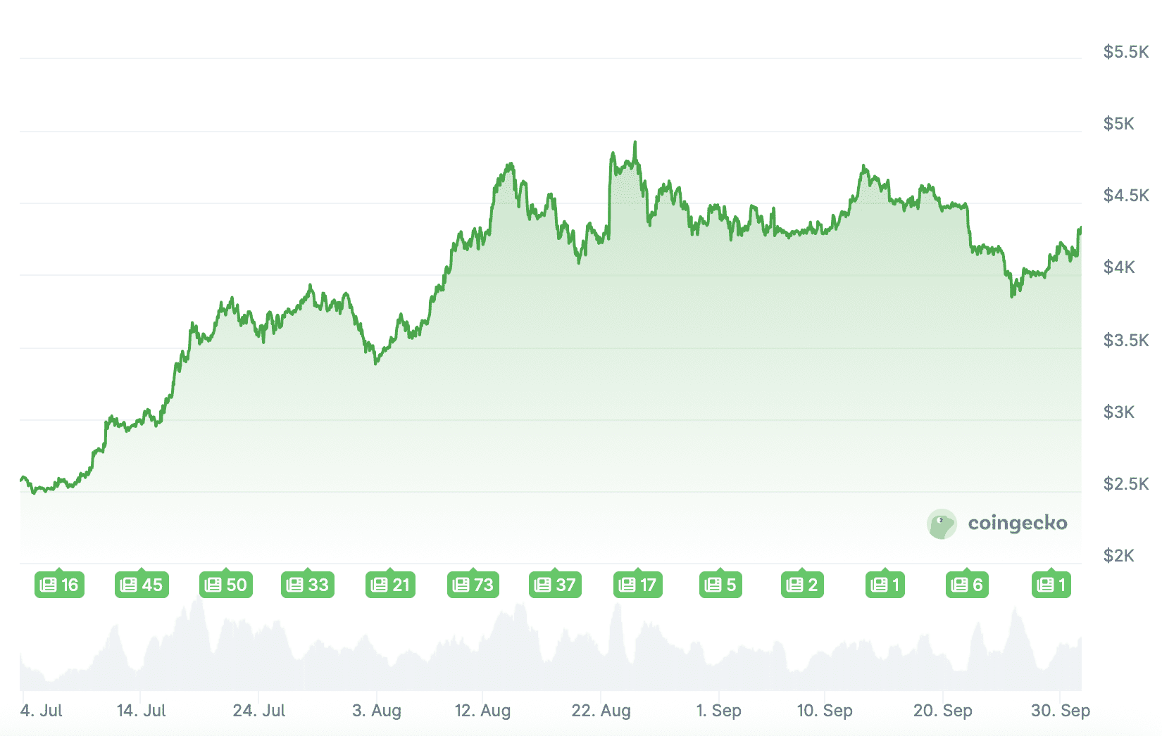 Zum Zeitpunkt des Schreibens steht der Kurs von Ethereum bei etwa 4.340 Dollar.