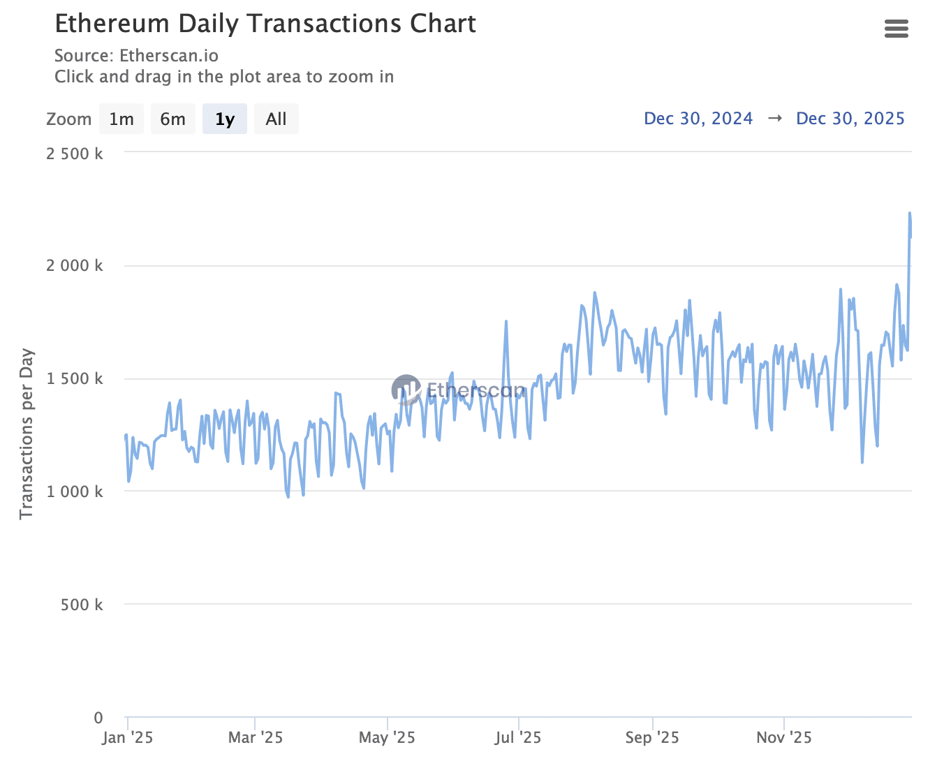 Gleichzeitig hat die Anzahl der Transaktionen auf Ethereum in diesem Monat einen Höchststand erreicht. Am 29. Dezember wurden an einem einzigen Tag mehr als 2,23 Millionen Transaktionen auf Ethereum verarbeitet – ein Meilenstein für das Netzwerk.