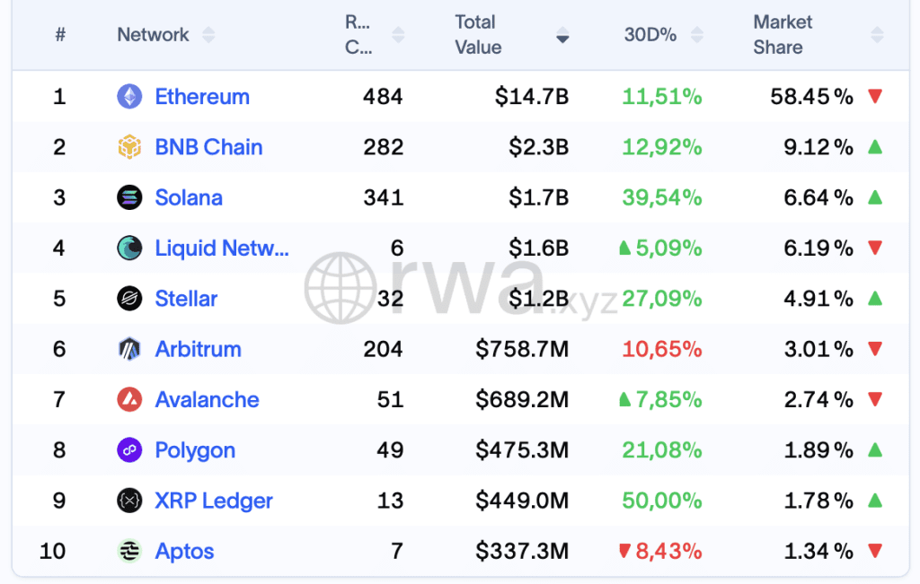 Dieser Markt wächst rasant und erreicht laut Daten von rwa.xyz inzwischen ein Gesamtvolumen von 24 Milliarden Euro. Der mit Abstand größte Anteil, rund 14 Milliarden Euro, existiert auf dem Ethereum-Netzwerk.