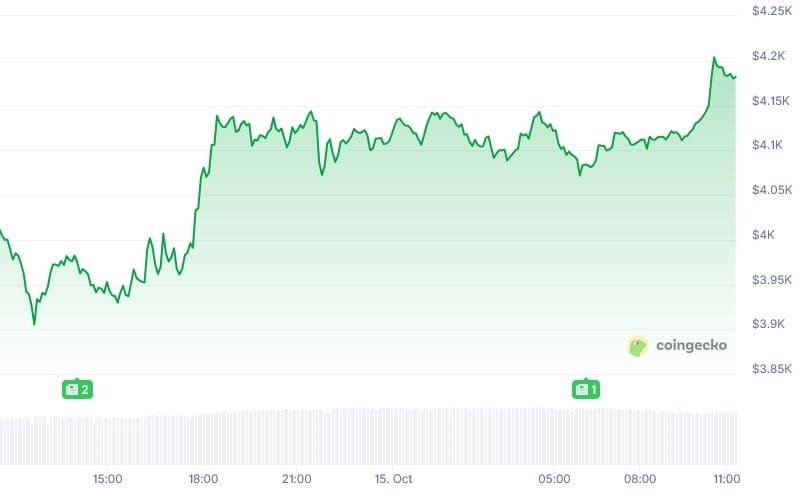 Ethereum (ETH) verzeichnete in den letzten 24 Stunden einen Kursanstieg von rund 4 % und liegt derzeit bei etwa 4.200 US-Dollar.