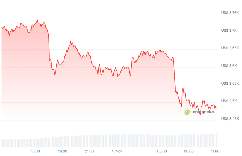 Der zweite Einbruch folgte heute Morgen um 06:00 Uhr, erneut ein Rückgang um 4 %, diesmal von 3.630 $ auf 3.480 $. Insgesamt liegt der Kurs damit in den letzten 24 Stunden rund 6 % im Minus.