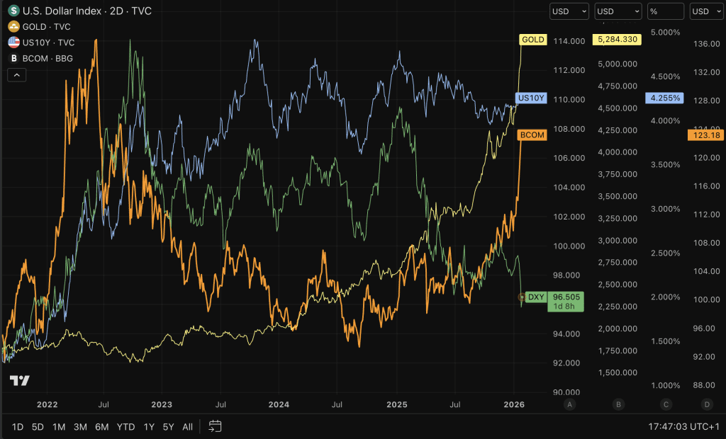 Die vergangenen Jahre sind geprägt von zunehmender geopolitischer Unruhe und Unsicherheit. Die Zinsen steigen, der US-Dollar verliert an Boden und Gold floriert als sicherer Hafen. Dieses Muster sahen wir bereits früher, beispielsweise im April 2025, aber diesmal fühlt es sich anders an. Weniger explosiv vielleicht, damals sorgten Trump-Zölle für heftige Marktvolatilität, aber fundamentaler. Als ob sich die Unterströmung verschoben hätte.