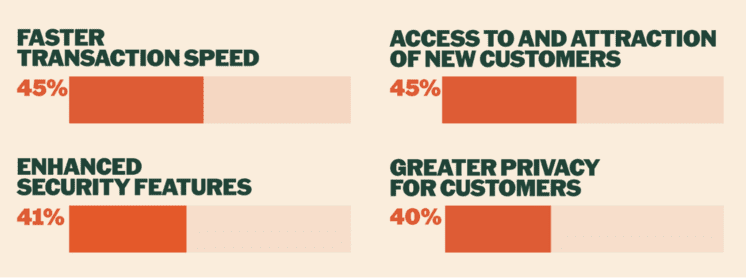 Geschäfte nennen mehrere Vorteile beim Akzeptieren von Krypto. So nennt 45 Prozent schnellere Bezahlungen als wichtigen Punkt. Auch sagt 45 Prozent, dass Krypto hilft, neue Kunden anzuziehen. Weiter sieht 41 Prozent bessere Sicherheit als Vorteil, während 40 Prozent auf mehr Privatsphäre für Kunden hinweist.