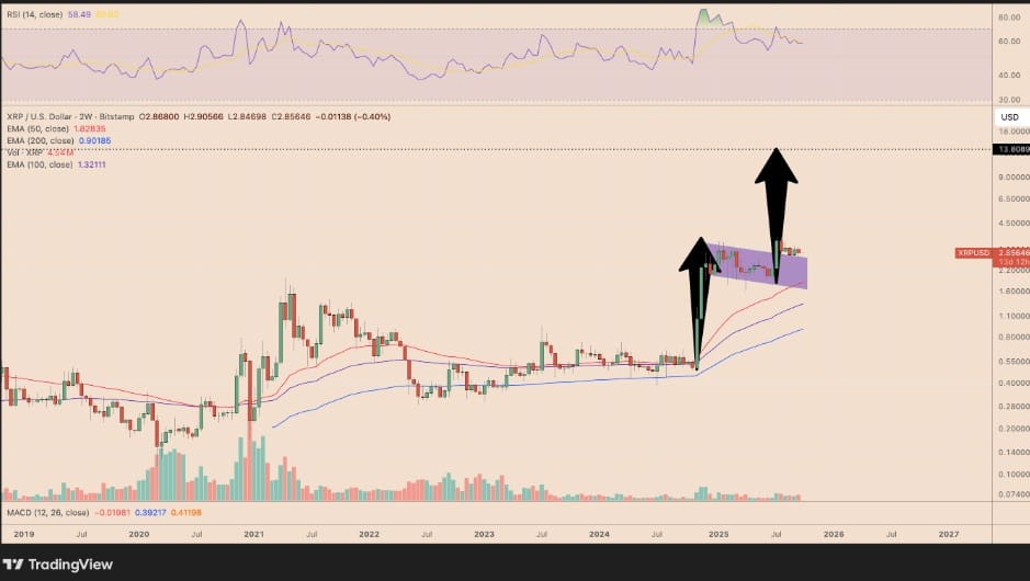 Wird sich die Geschichte wiederholen? Der aktuelle XRP-Kurs von 2,86 Dollar liegt 20 Prozent unter dem Allzeithoch von 3,65 Dollar. Die Kryptowährung erreichte diesen Höchststand nicht 2017, sondern am 18. Juli 2025.